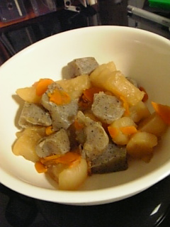甘い味つけにしました。大根下ゆでしただけあって味しみててうまい!こんにゃくに味がついたのは奇跡だと思いました(笑)案外できるものだな適当で(笑)しかし鍋が小さくてキノコが入り切らなかったのがせつない(だから入ってないんですが)あと椎茸は高い気がします畜生(笑)煮物には入っててほしい代物なんですが(笑)